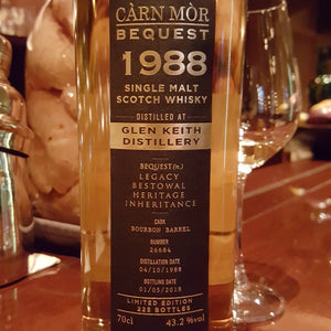 Glen Keith 1988, 29 years, Càrn Mòr Bequest, Bourbon Barrel Number 26684, 225 bottles, 43.2% abv.Like the majority of UK distilleries, Glen Kei... -